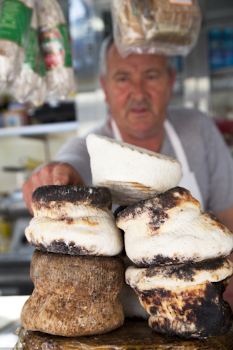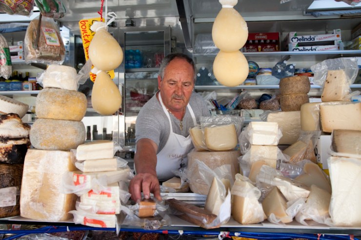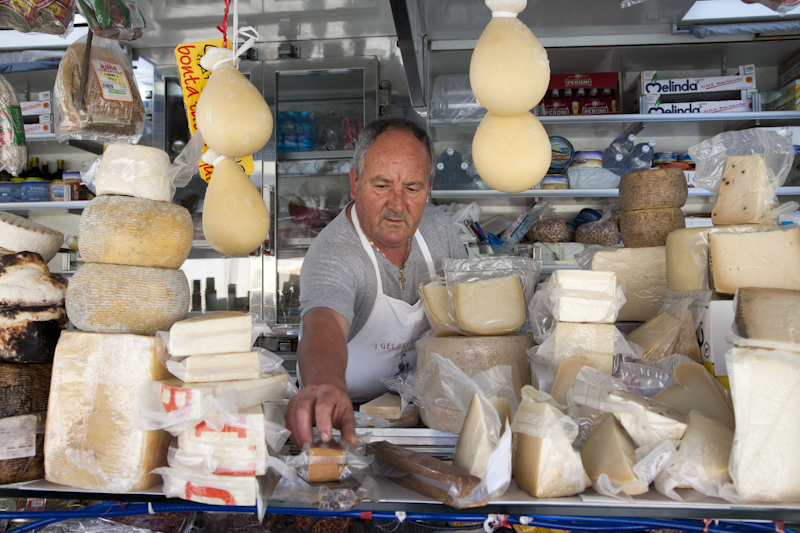Choosing was difficult and the other vendor, the one hiding behind the cheese, kept egging me on. Older than his counterpart, perhaps father to the son, he had a toothless, jowly grin that didn’t necessarily enhance the pecorino – of which there was plenty, some covered in grape must, some seasoned with black peppercorn.  Wielding a large knife, he pantomimed slicing off a chunk of this or that, and before long, I was on a cheese mission.
