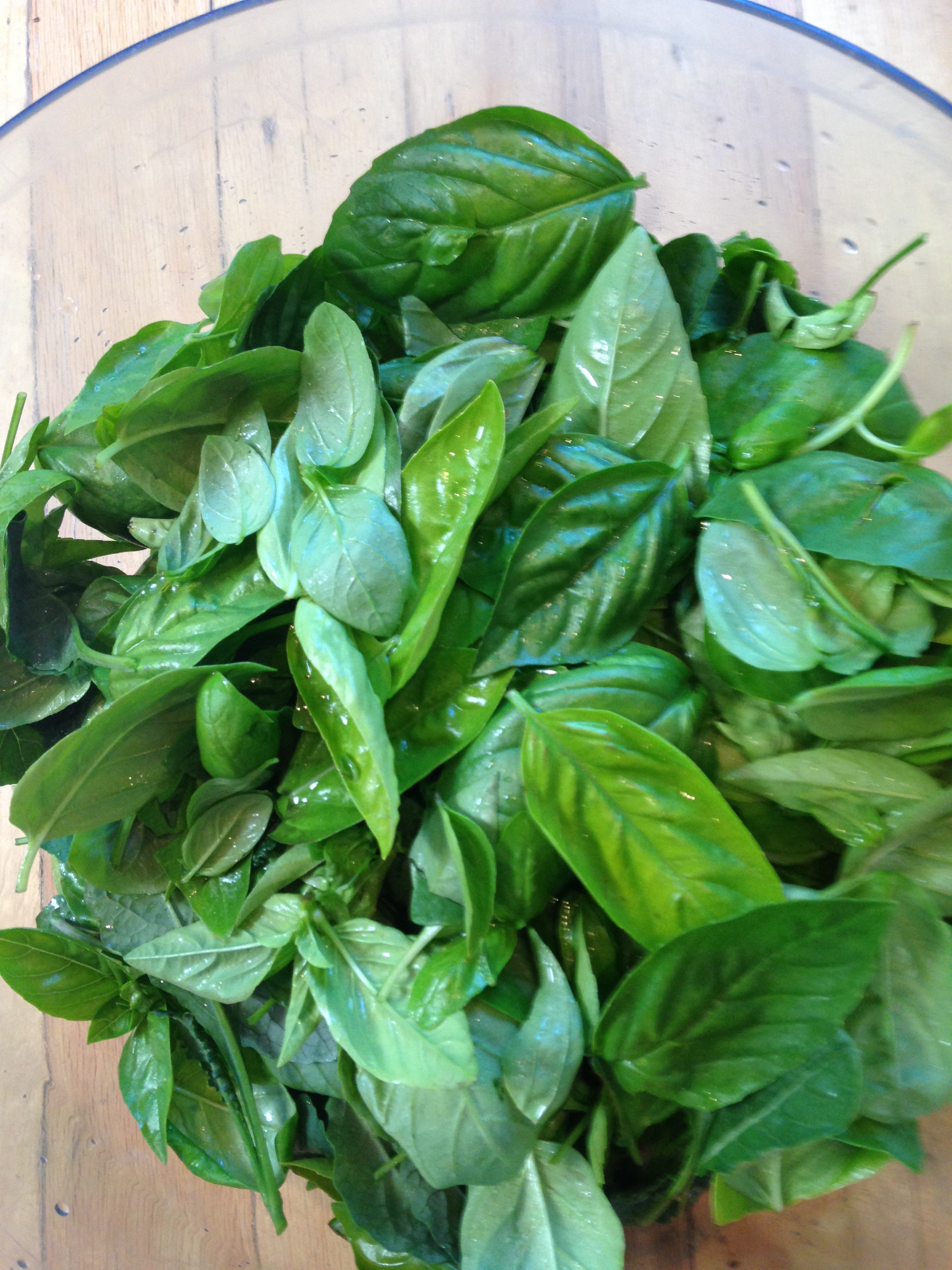 This is a very basic recipe that is open to modification. If you have a bumper basil crop as I did this year, you can triple it. If you want to mix it up a bit, substitute some of the basil with flat-leaf parsley, chives, arugula or baby kale. Add twice the oil if you like a less green, richer sauce. Even the pine nuts can be substituted with Macadamia nuts, blanched almonds or even tahini. Many cooks like to add Parmigiano Reggiano but I like to hold off and serve it freshly grated over pasta that is tossed with pesto.