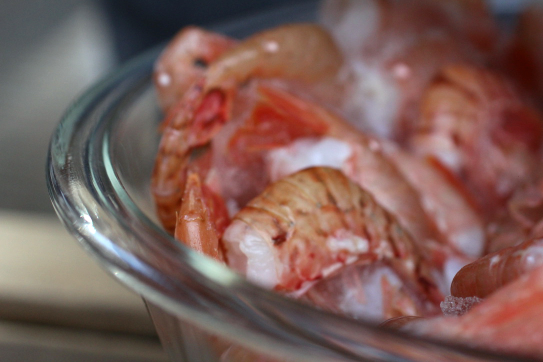 Once in a while Bugs’ unidentified wife hands me a parcel the size of a basketball, tightly taped in a sheet of foamy PVC then she winks. These prawns are headless and packed in solid ice, all curly and brown-pink. They take a few hours to thaw in my sink, surrounded by water in a silver bowl.