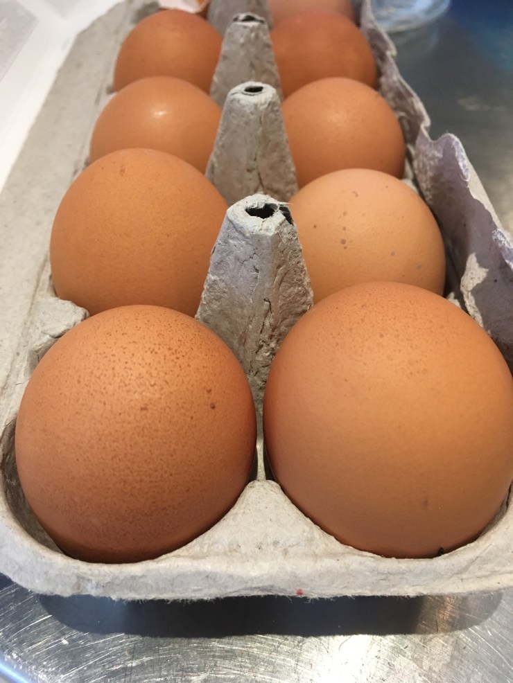 “Want it?” asked this tiny blond woman in very tall boots as she smiled and giggled, offering me the handles of a large, wired egg basket. We were standing with the hens, the air a cackling, bawk-ing din, intermingled with saw dust and chicken shit.