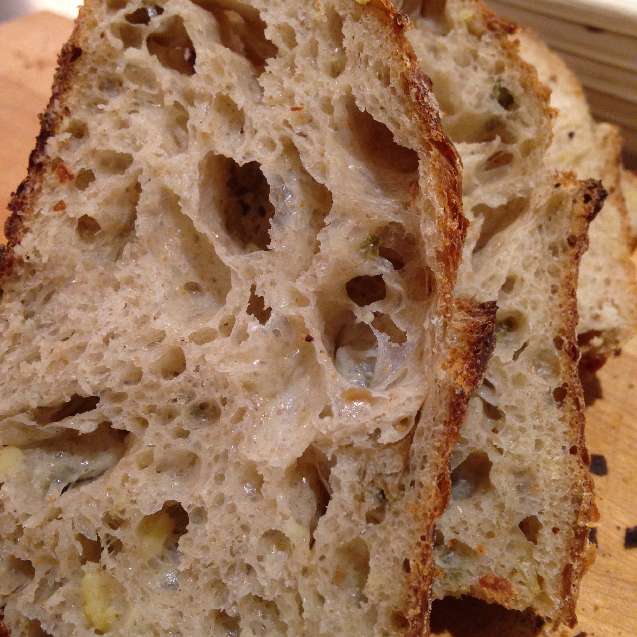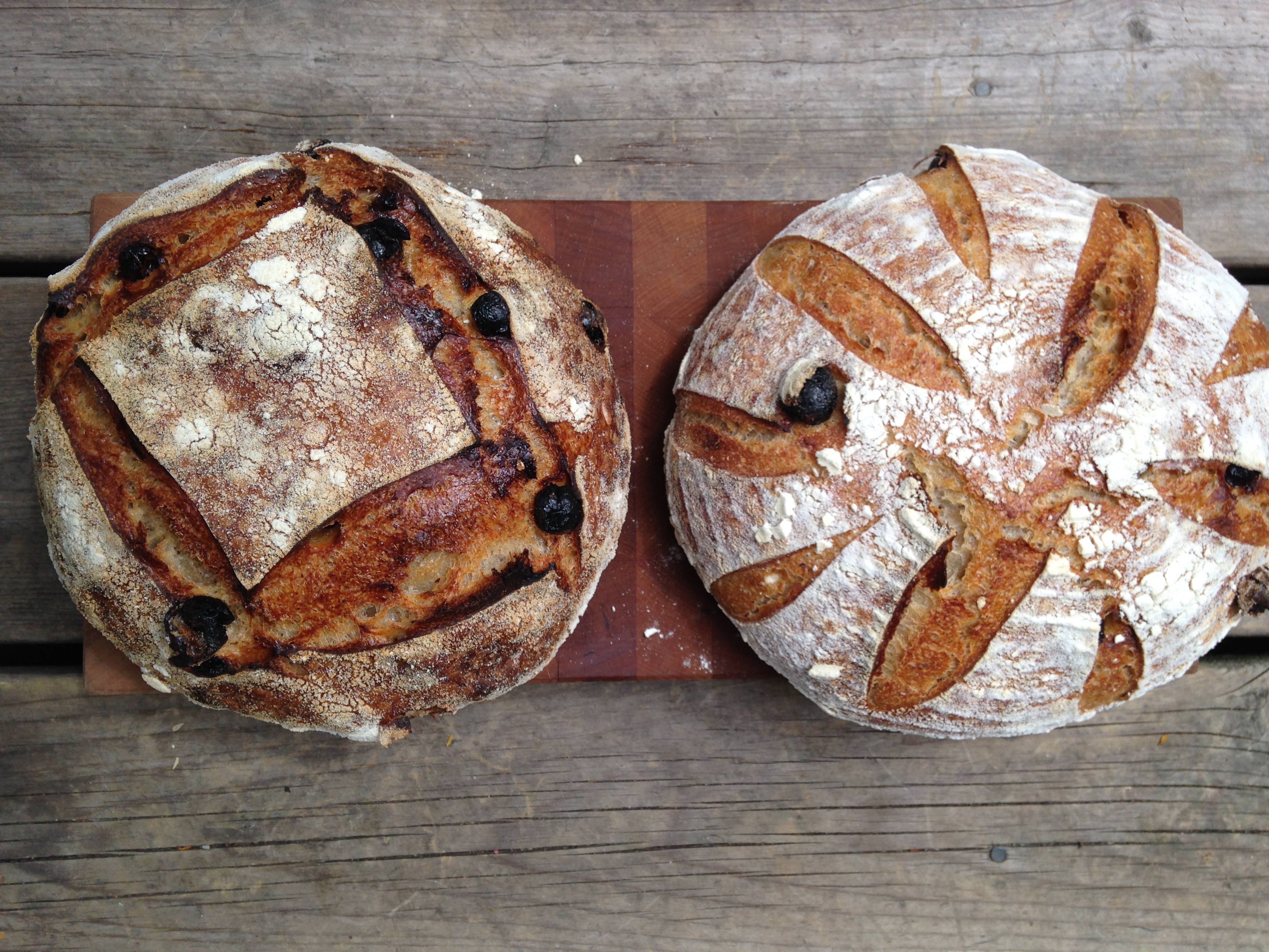 [ This dough is very extensible and stretched a yard when I scraped it from the mixing bowl to a plastic bin. I got the same results during stretch and folds. It baked up high, with a dark mahogany crust with traces of raisin and cinnamon in the air.