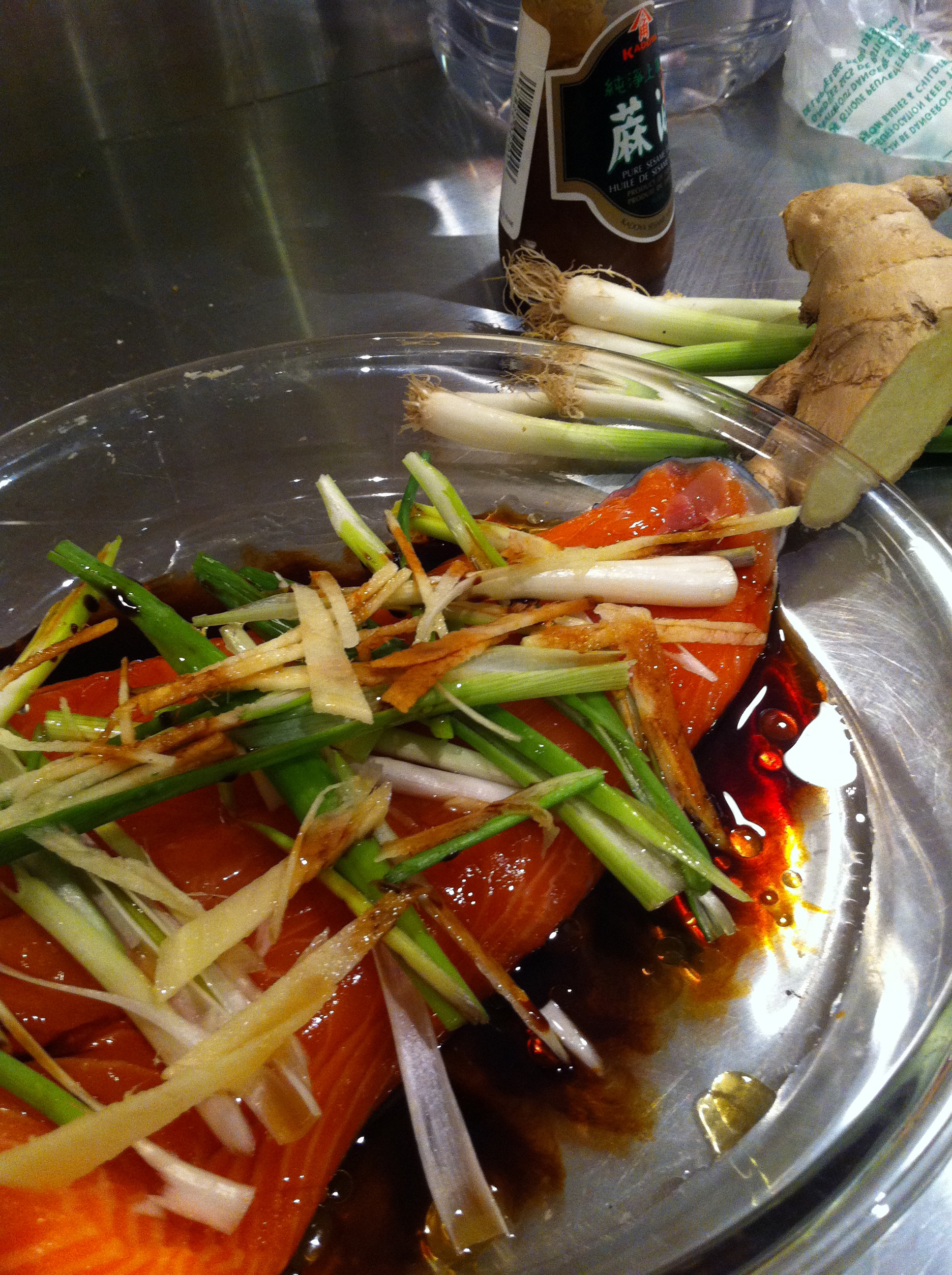 1 lb/450 gm sea bass, cod, salmon, haddock, tilapia or halibut fillet, cut into 4 pieces Sauce: 2 TBS black bean and garlic sauce OR 2 tsp soy sauce 2 tsp toasted sesame oil 2 TBS water 2 TBS Japanese mirin or cooking sherry 1 three-inch knob ginger, peeled and thinly sliced into matchsticks 3 green onion OR 1 small leek, thinly sliced lengthwise 2 TBS fresh coriander, chopped Mix sauce ingredients in a small bowl. Place fillets in a heat-proof dish that will fit inside an aluminum or bamboo steamer. (Or, create your own steamer by placing a rack set in a large skillet.) Using a spoon, place an equal amount of sauce on each fillet. Sprinkle over with ginger matchsticks and green onions or leek. Bring several inches of water to boil in the steamer. Wearing oven gloves, place the dish with fillets into the steamer. Cover and steam 8-10 minutes on high, or until the fish flakes at the touch of a fork and is opaque in the middle. Garnish with fresh coriander and serve over steamed rice. © 2015 Madeleine GreeyChinese-style steamed fish